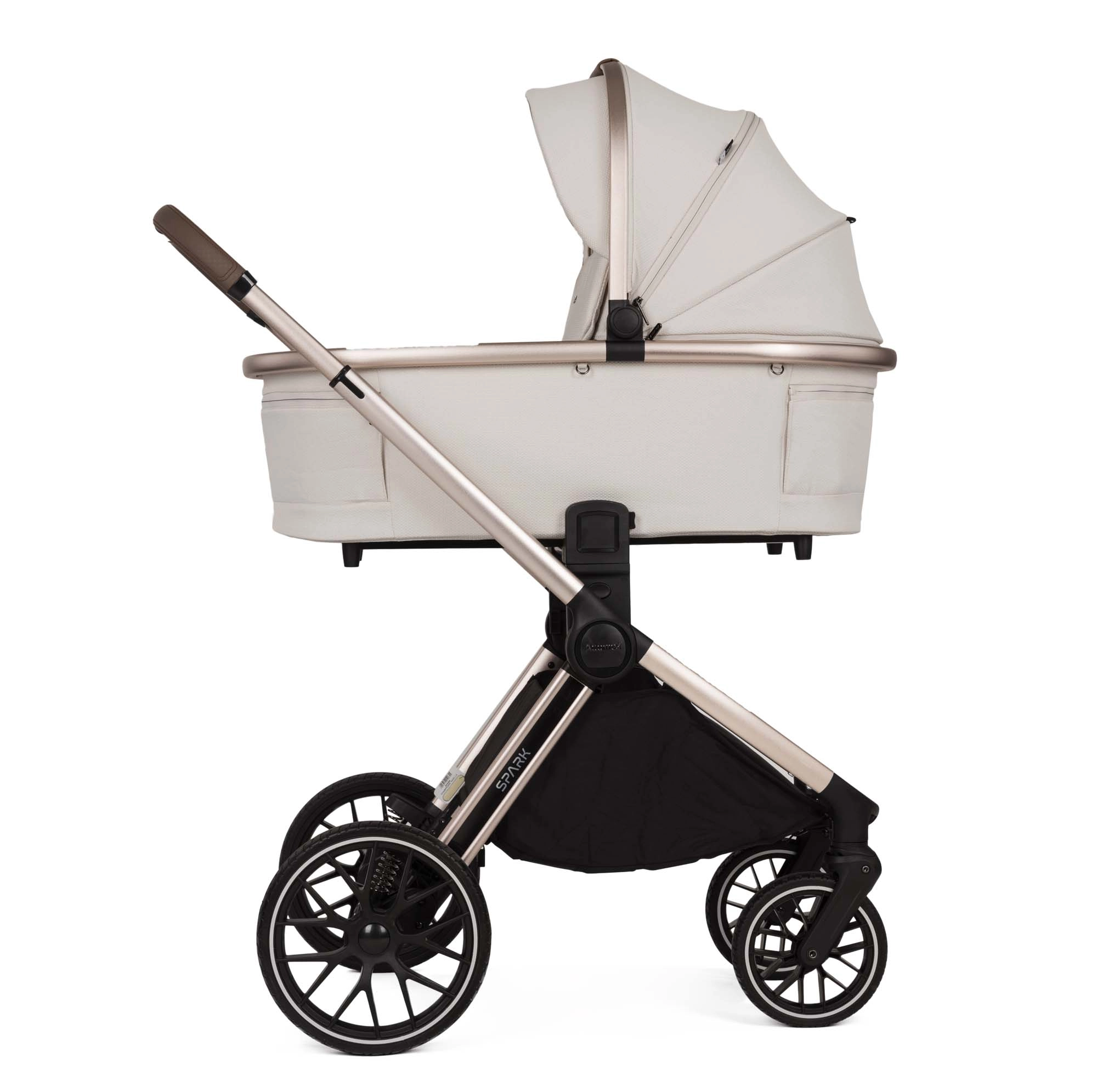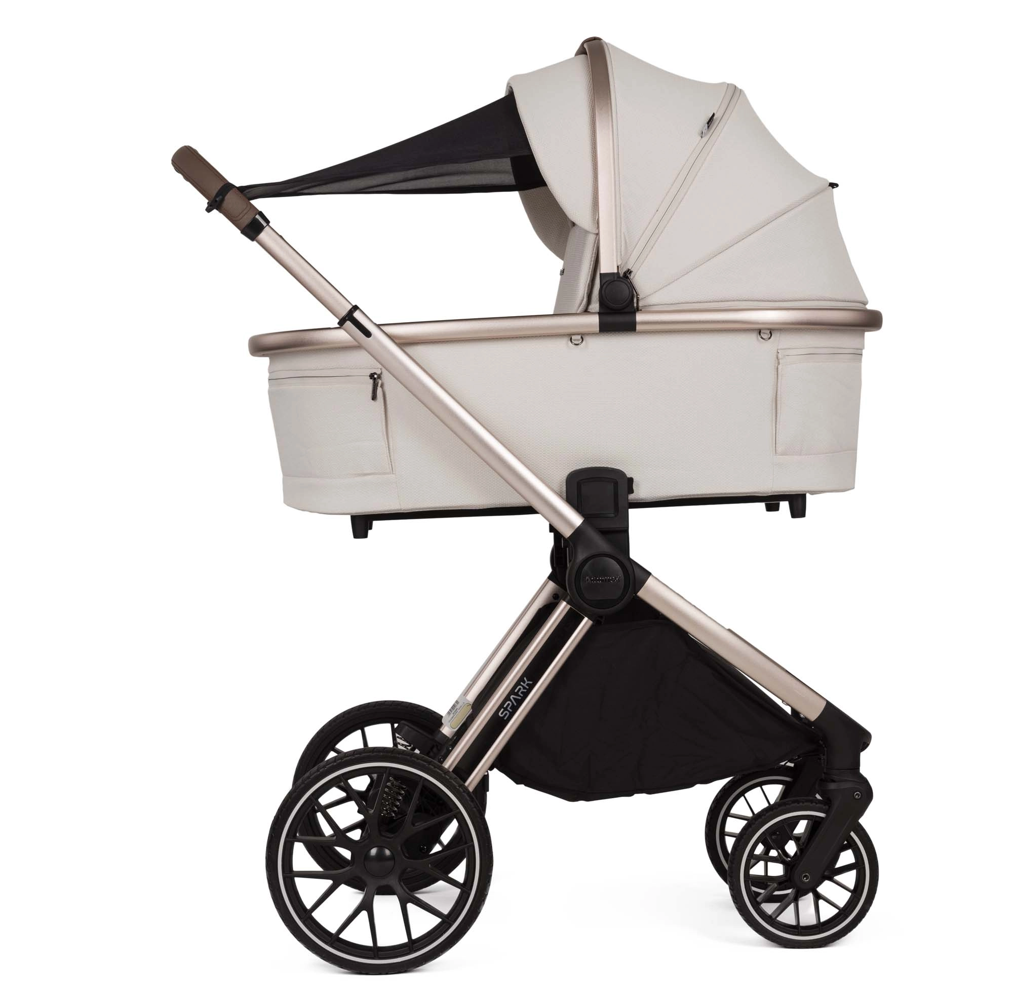 SPARK kolica su 2-u-1 model koji karakteriziraju funkcionalnost i stil. Dizajnirana su s pažnjom na najsitnije detalje, nudeći iznimnu udobnost i za bebu i za roditelje. Verzija Champagne ima eloksirani okvir boje šampanjskog zlata i elegantne tamne polirane detalje.