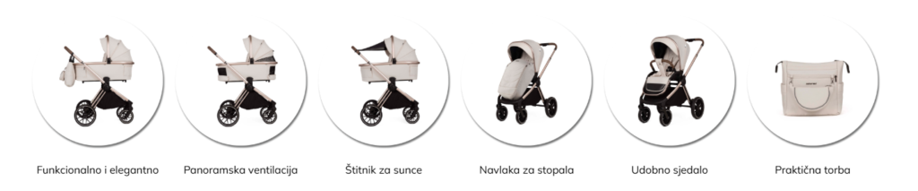 - Gondola kapuljača je opremljena produljivim klinom koji pruža dodatnu zaštitu od vjetra ili sunca te ventilacijskim klinom s mrežom protiv komaraca koja omogućuje pravilnu cirkulaciju zraka.