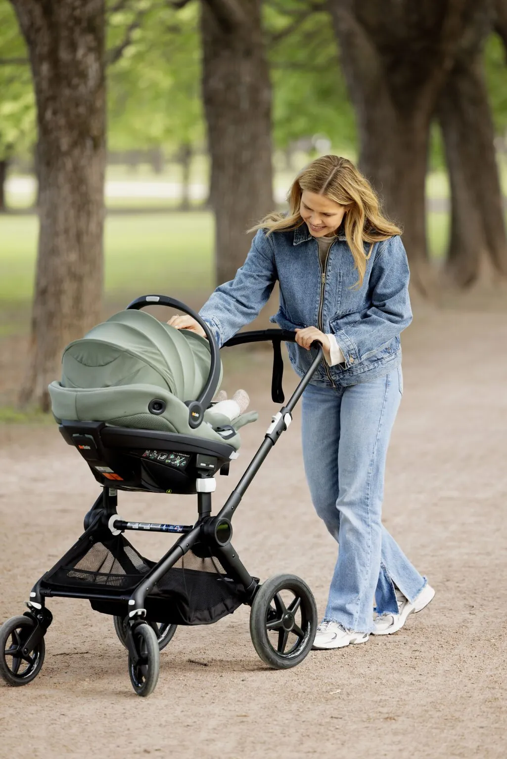 Elegantni mat završetak i tamni okvir sjedalice savršeno se uklapaju na tamne okvire kolica, za sofisticiran i usklađen izgled.