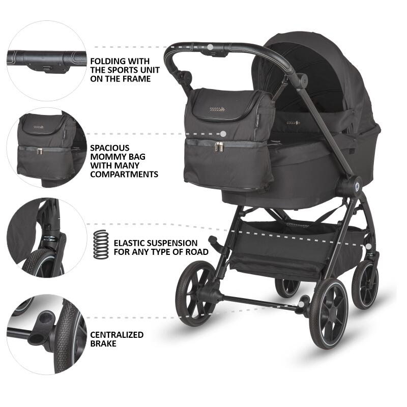 Konstrukcija kolica izrađena je od mat crnog aluminija, što nudi izdržljivost te moderan i elegantan izgled. Presvlaka je izrađena od debelog, otpornog tekstilnog materijala, a unutrašnjost tende obložena je nježnom tkaninom u odgovarajućoj nijansi – izbor koji osigurava toplinsku i estetsku udobnost.