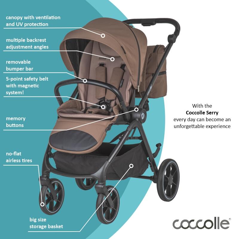 Dizajnirana za moderne roditelje koji žele svestrana, elegantna i dobro opremljena kolica, Coccolle Serry 3 u 1 kombinira sofisticirani dizajn s vrhunskom funkcionalnošću kako bi pružila potpuno iskustvo i za bebu i za roditelje.