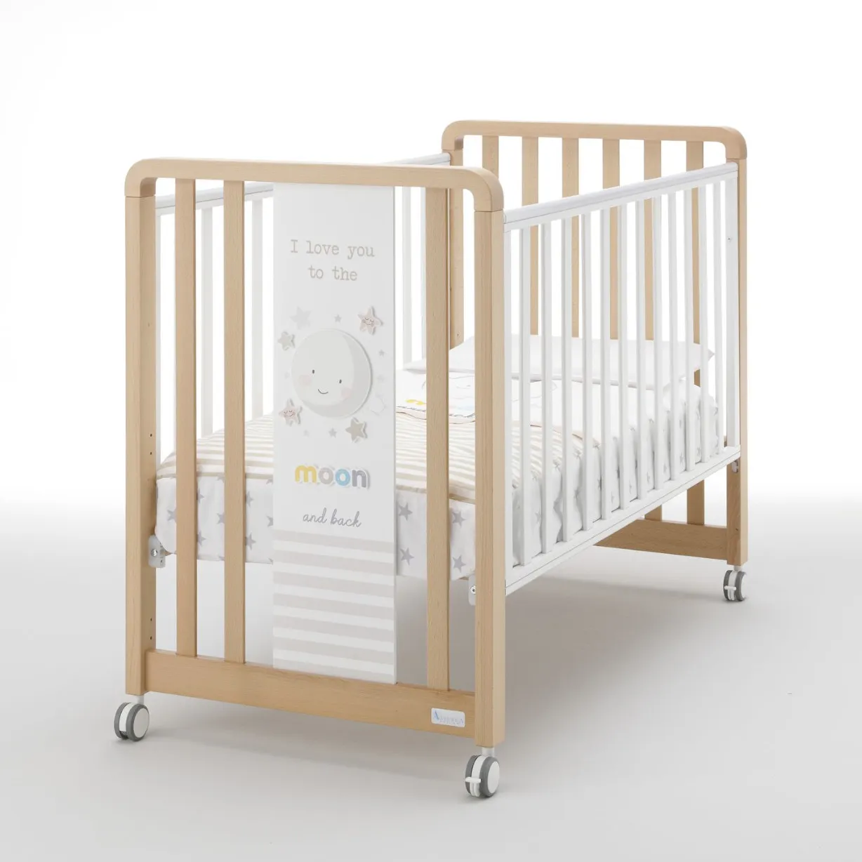 Kako bi se olakšalo kretanje, krevetić ima 4 okretna kotača, od kojih 2 sa kočnicama.