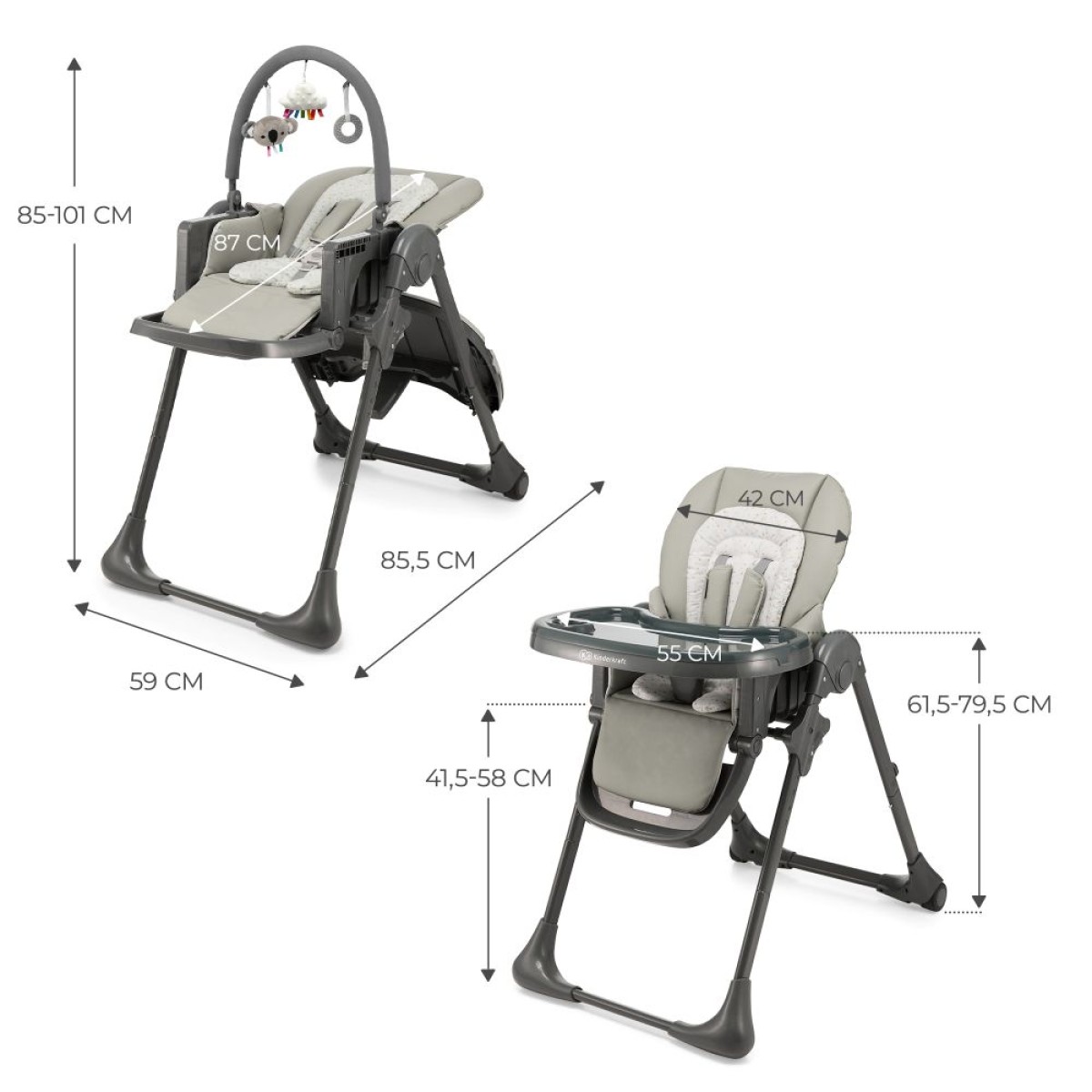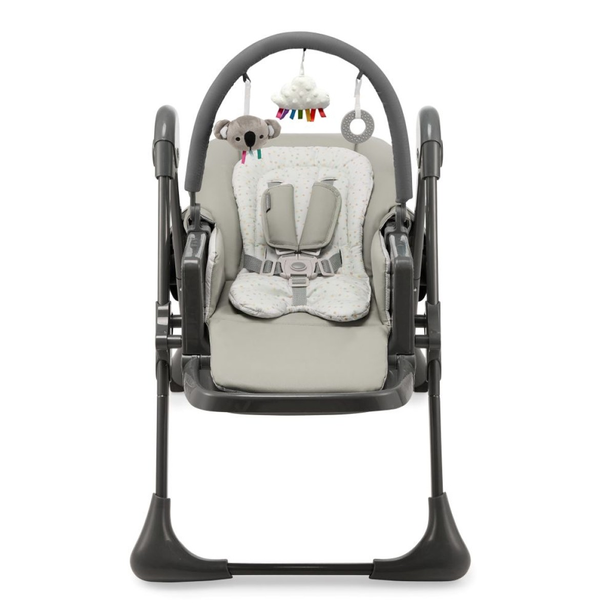 Hranilica Tummie ima podesiv naslon (4 položaja) i oslonac za noge (3 položaja) – zahvaljujući tim mogućnostima podešavanja možete je pretvoriti u ležaljku. Uključeni uklonjivi umetak s naslonom za glavu za najmlađe osigurava udobnost i sigurnost svakog djeteta. Kada se koristi kao ležaljka, Tummie će zabaviti vaše dijete lukom s igračkama koji potiče dijete da pruži ruke i jača hvat.