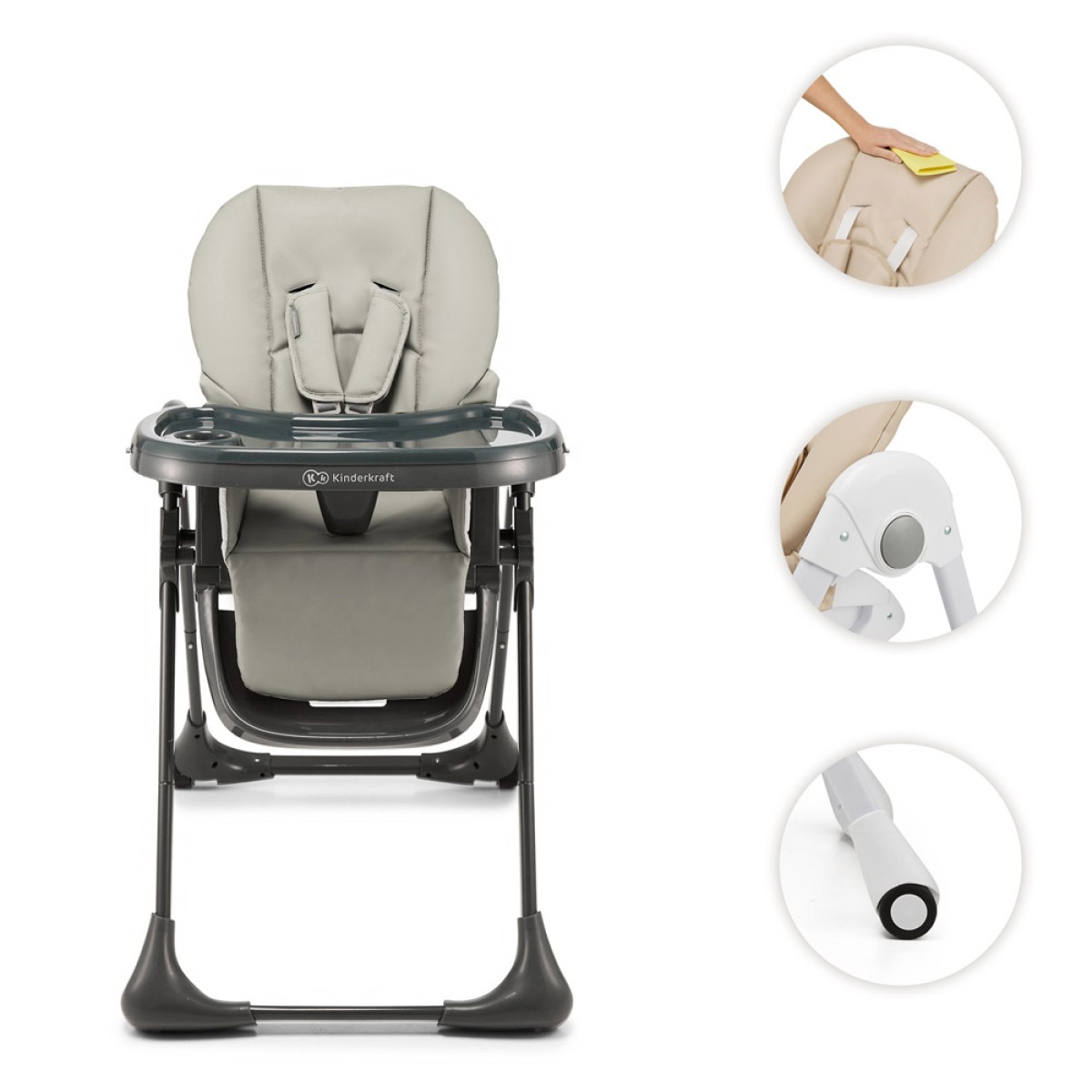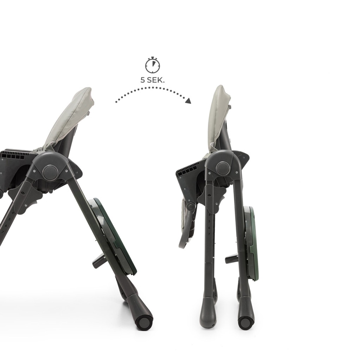 Tummie je sklopiva hranilica – kada vaše dijete završi s hranjenjem ili igrom, možete je gotovo potpuno sklopiti i odložiti sa strane ili u ormar. Pladanj se može skinuti i objesiti na kuku na stražnjim nogama stolice – savršeno rješenje, osobito za manje stanove. Tummie je također opremljena s 2 kotačića, koji omogućuju lako premještanje između dnevnog boravka, kuhinje ili blagovaonice.
