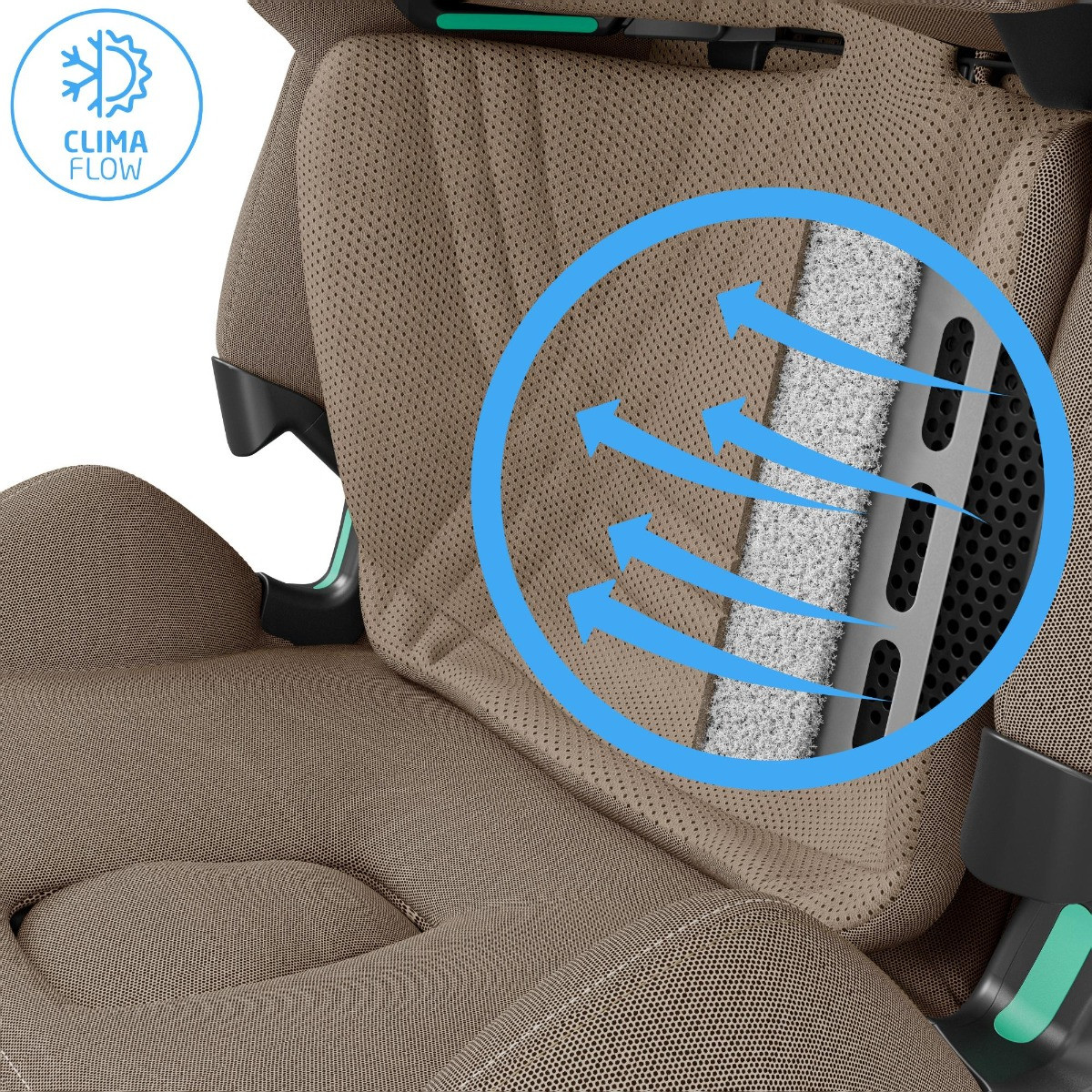 Sjedalica omogućuje vožnju okrenutu prema natrag od 60–105 cm te okrenutu prema naprijed od 76–150 cm (naprijed od najmanje 15 mjeseci). Pet položaja nagiba i naslon za glavu podesiv po visini osiguravaju optimalnu ergonomiju u svakoj fazi rasta. ClimaFlow ventilacijski paneli, prozračna pjena i Eco Care reciklirane tkanine reguliraju temperaturu tijekom cijele godine, dok su navlake u potpunosti uklonjive i perive u perilici rublja.